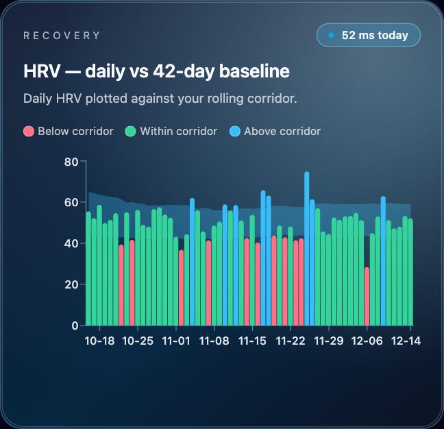 Physiologically, the body held up better than expected. Despite less sleep, resting heart rate and HRV stayed within range. I didn’t feel depleted at any point. That matters. It tells me the base is there and the system is resilient. Data doesn’t replace judgement, but it sharpens it. When the signals stay stable under pressure, that’s a sign you’re not overreaching.