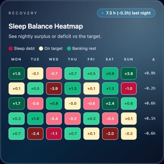 Sleep, however, was the tax. Long hours at work, late finishes, early starts. Not ideal, but also not a crisis. This is where realism matters. Life moves in cycles. There are weeks where recovery is optimised, and weeks where you simply push through. Pretending otherwise is naive. The mistake is not the lack of sleep; it’s the emotional overreaction to it. You acknowledge the dip, manage the load, and keep moving.